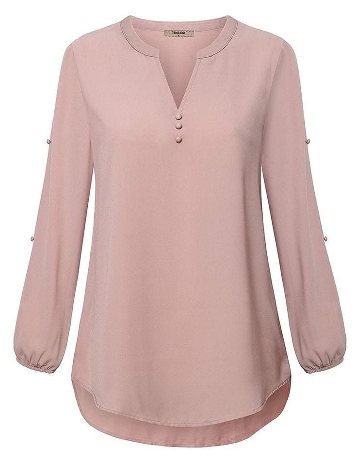Elevate your everyday wardrobe customize this effortlessly elegant blush pink tunic. Crafted from a soft, lightweight fabric, this top features a flattering relaxed silhouette that drapes beautifully for all-day comfort. The subtle V-notch neckline is accented with delicate button detailing, adding a refined touch to its minimalist design.